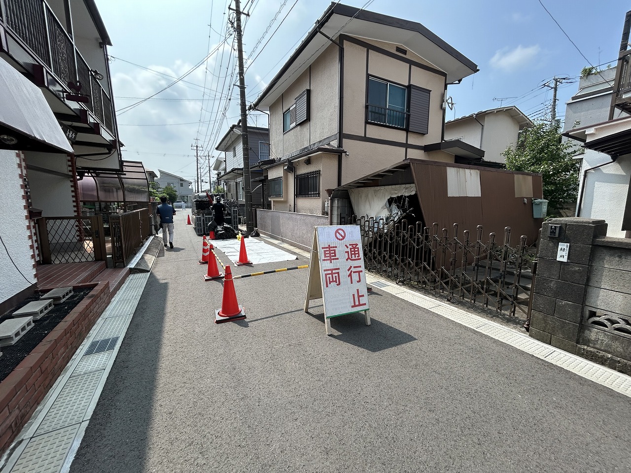 道路が狭いので、道路使用許可をとり道路を通行止めにします。