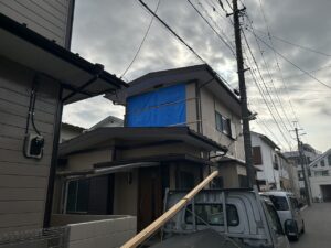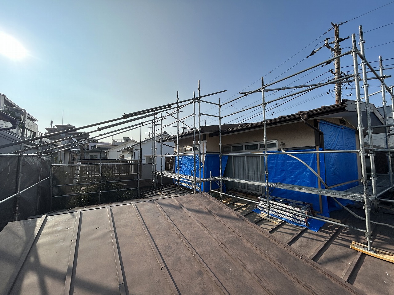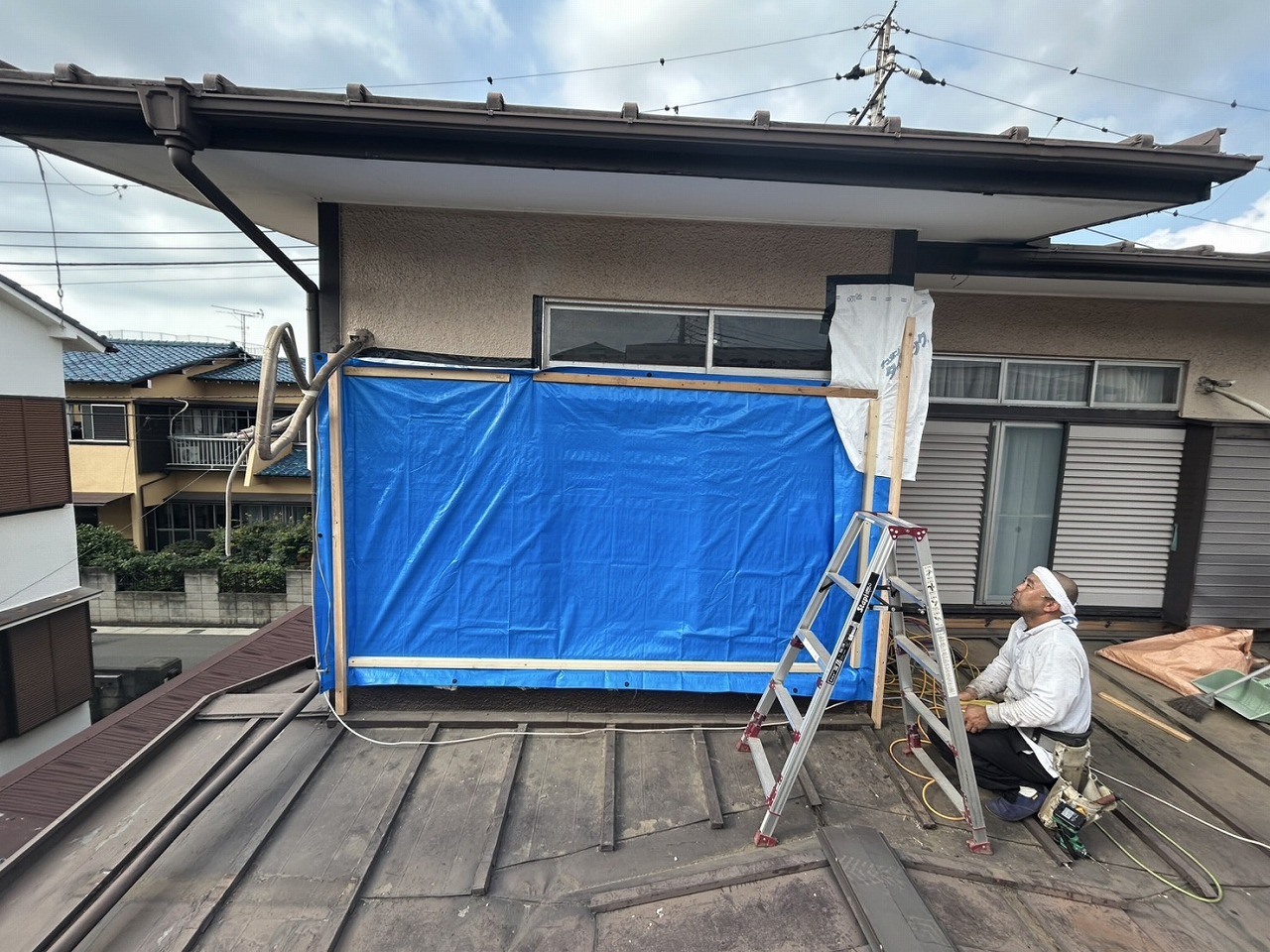 雨養生をして足場を組むのを待ちます。