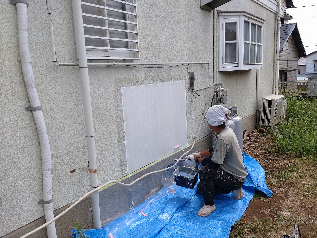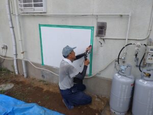 周りに塗料が付かないように養生していきます。