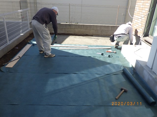 人工芝を敷くのですが、周りを少し空けて植物を植えたいとの事で、奥さんがやり易いように