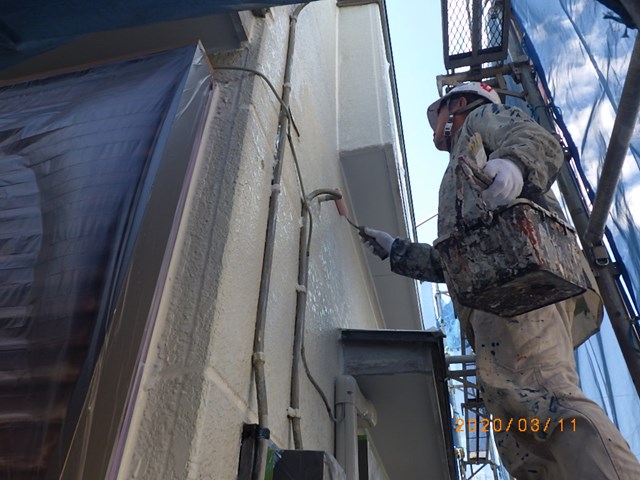 外部の改修です。壁のシーリング工事が終了し、塗装工事へ入ってます。