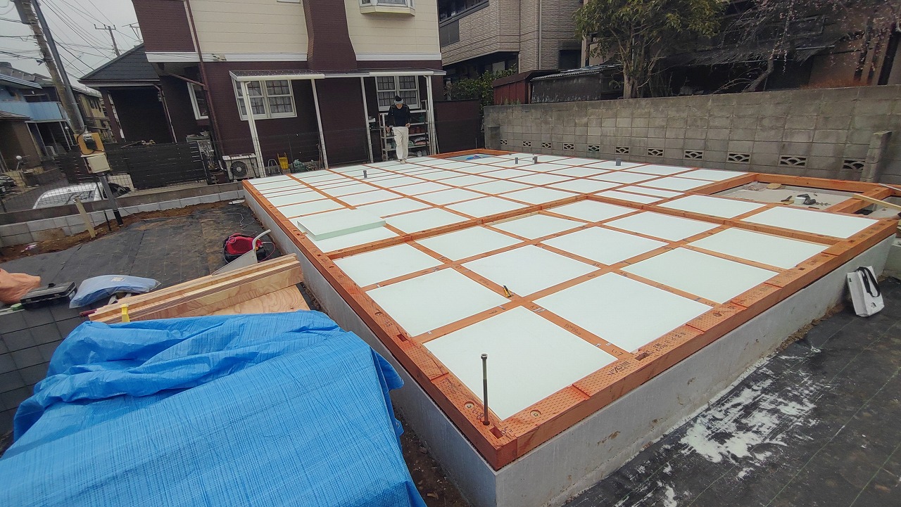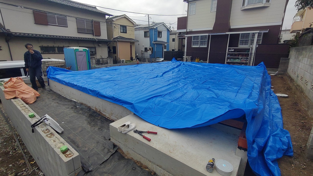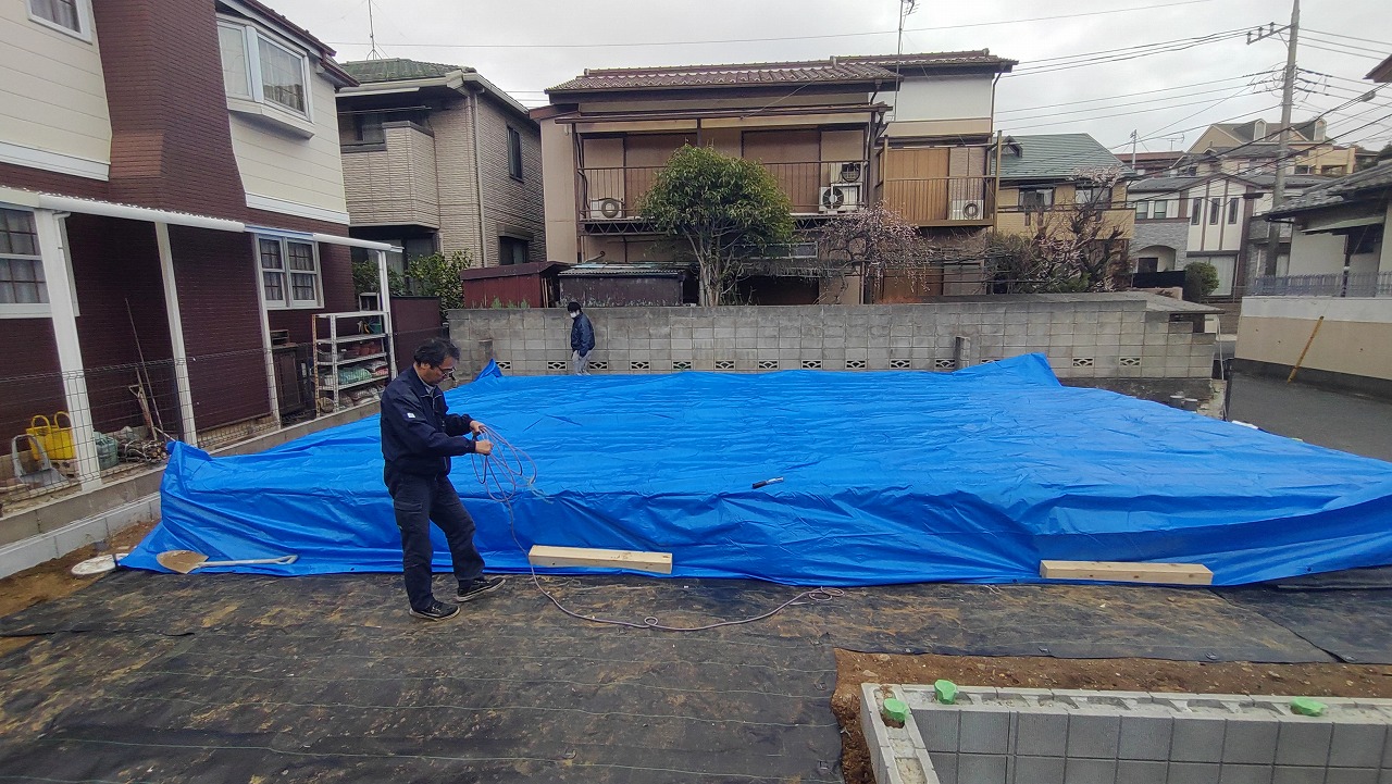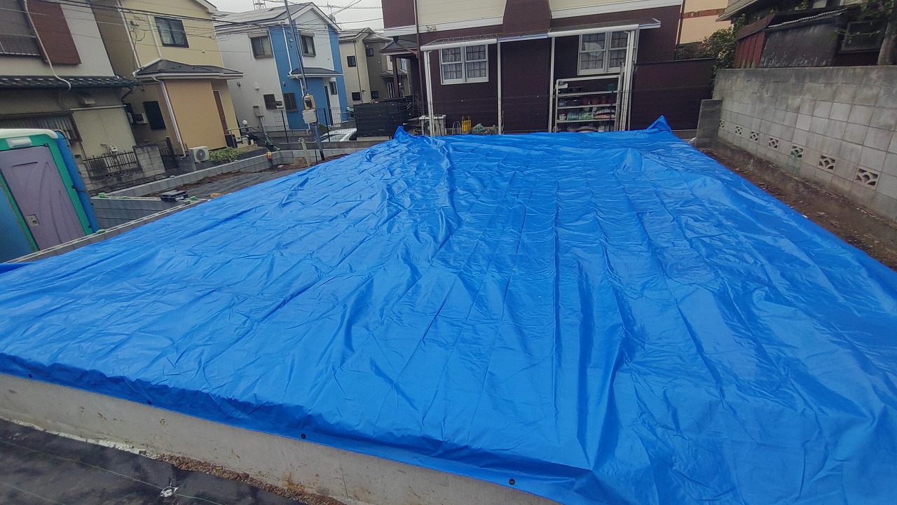 明日は1日雨の予報です。せっかく敷いた土台や断熱材を濡らす訳にはいきません。