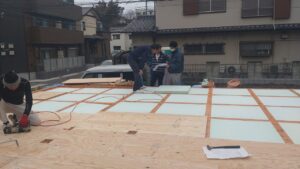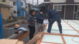 打合せを進めながら、手前で棟梁が床の合板ベニヤ張りをしていますね!